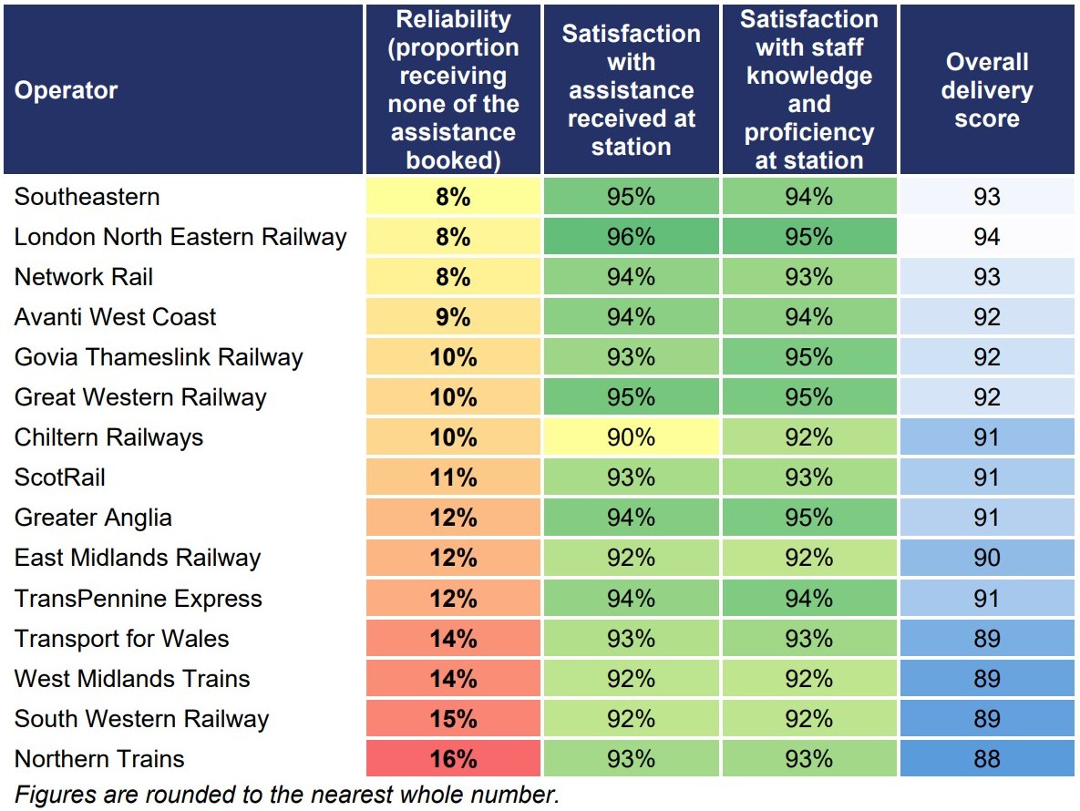 Operators are ranked by reliability (derived from the proportion receiving none of the assistance booked). A colour spectrum of yellow to red has been applied to these numbers, with the lowest number (8%) in yellow and highest number (16%) in red. Both satisfaction metrics (with assistance received at station, and with staff knowledge and proficiency at station) have a green to yellow colour spectrum applied, with the highest numbers (96%) in green and lowest (90%) in yellow. The overall delivery score applied to each station operator has a dark blue to light blue colour spectrum applied, with the lowest score (88) in dark blue and highest score (94) in light blue.